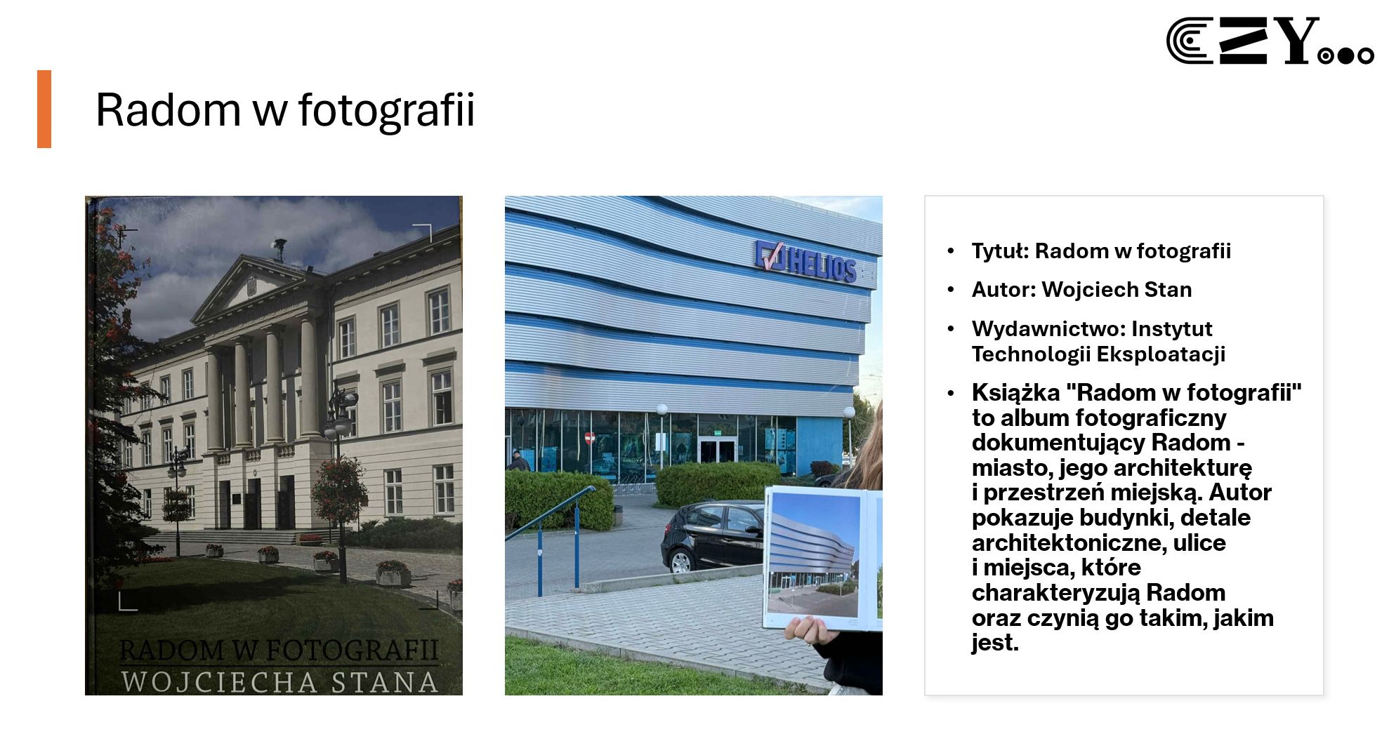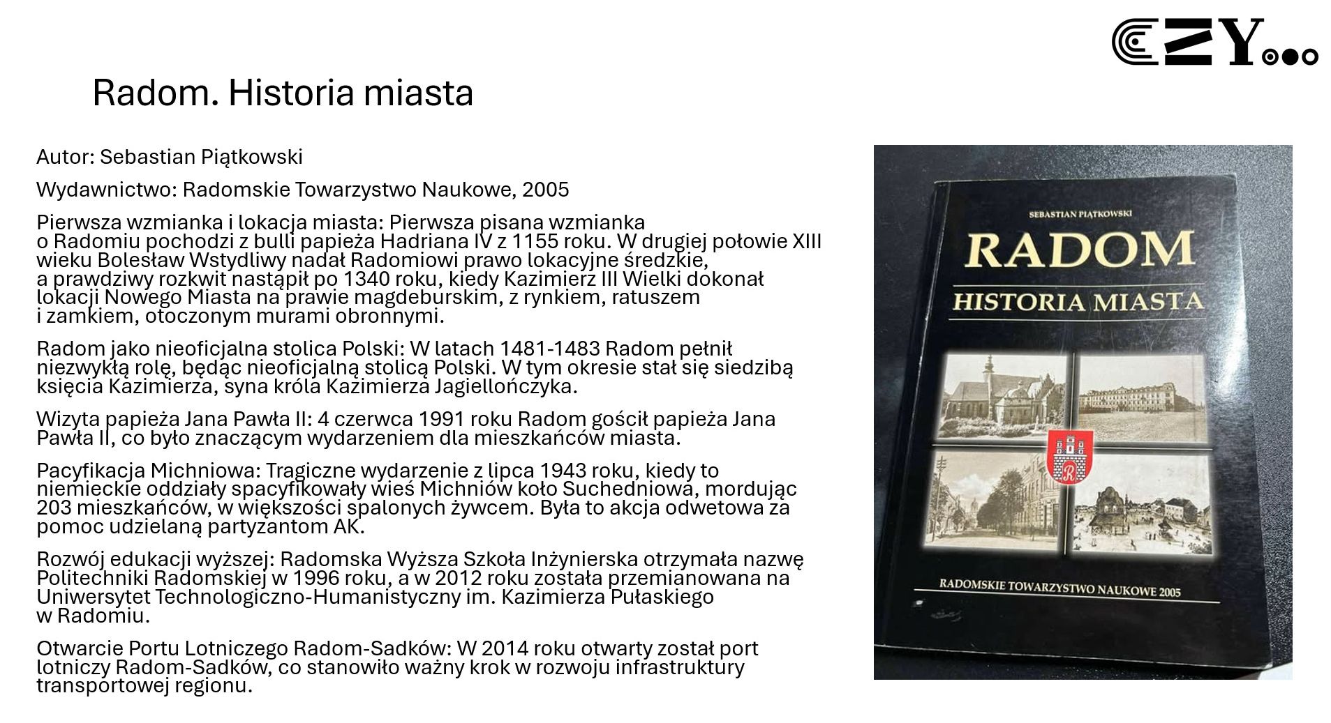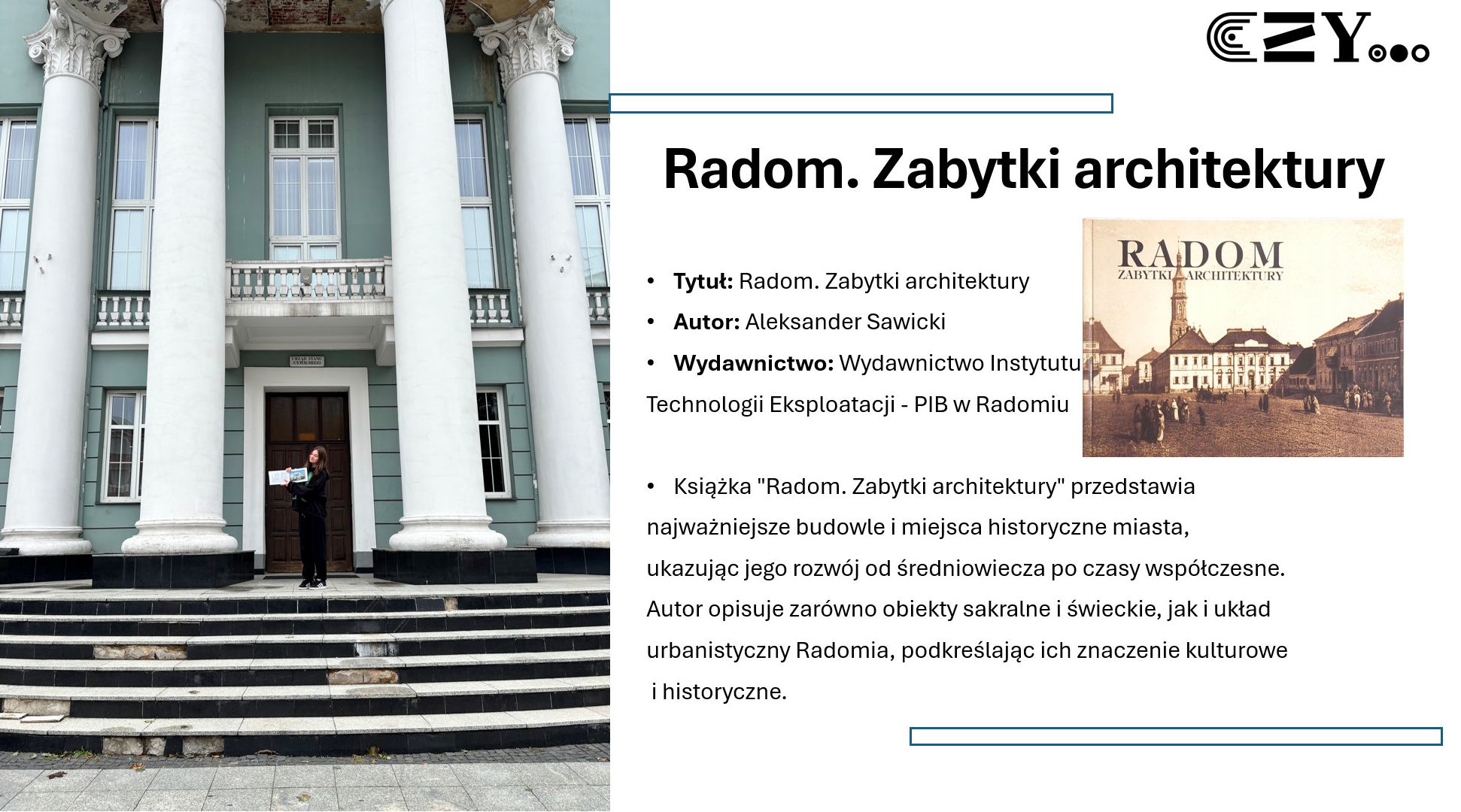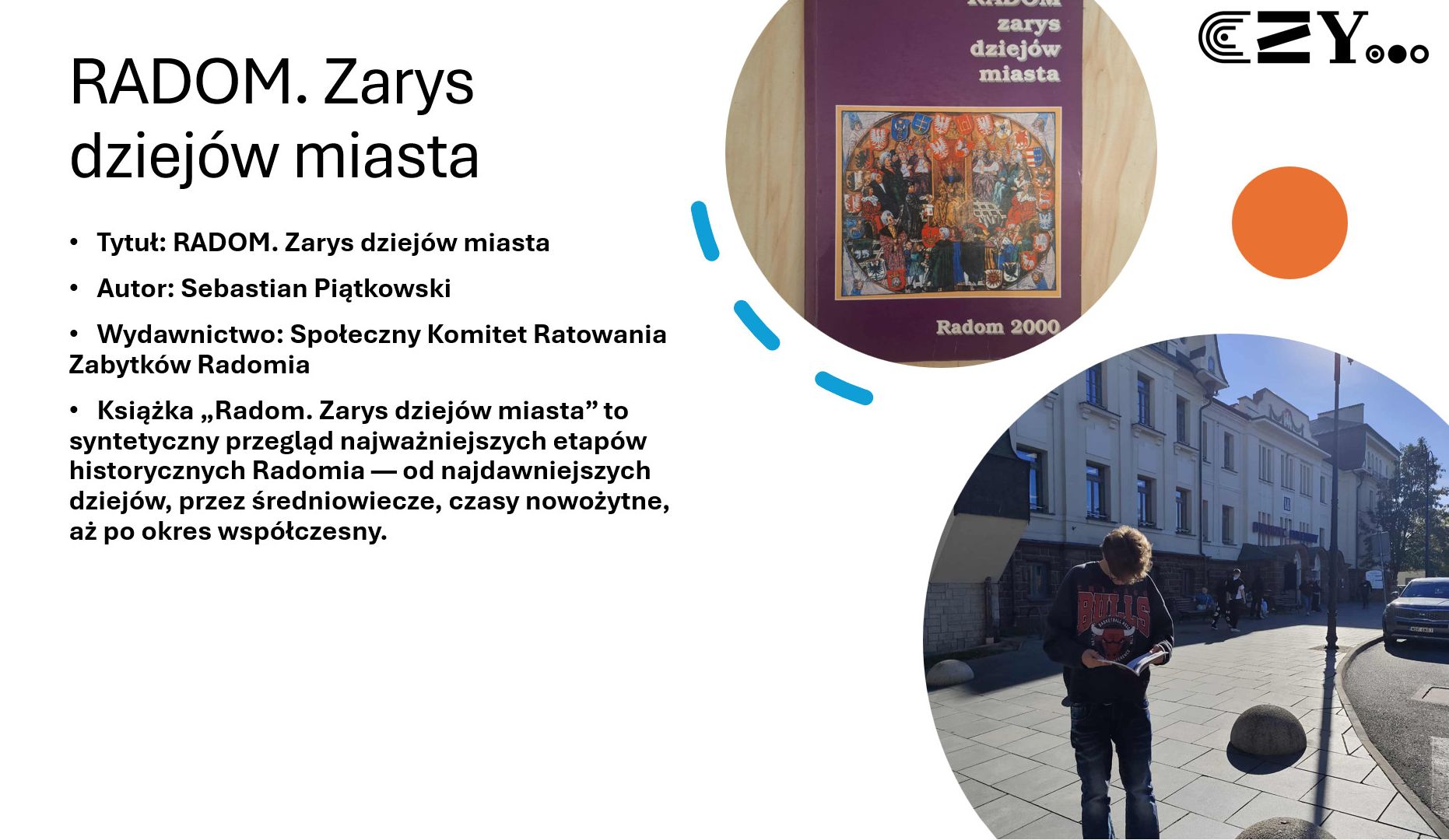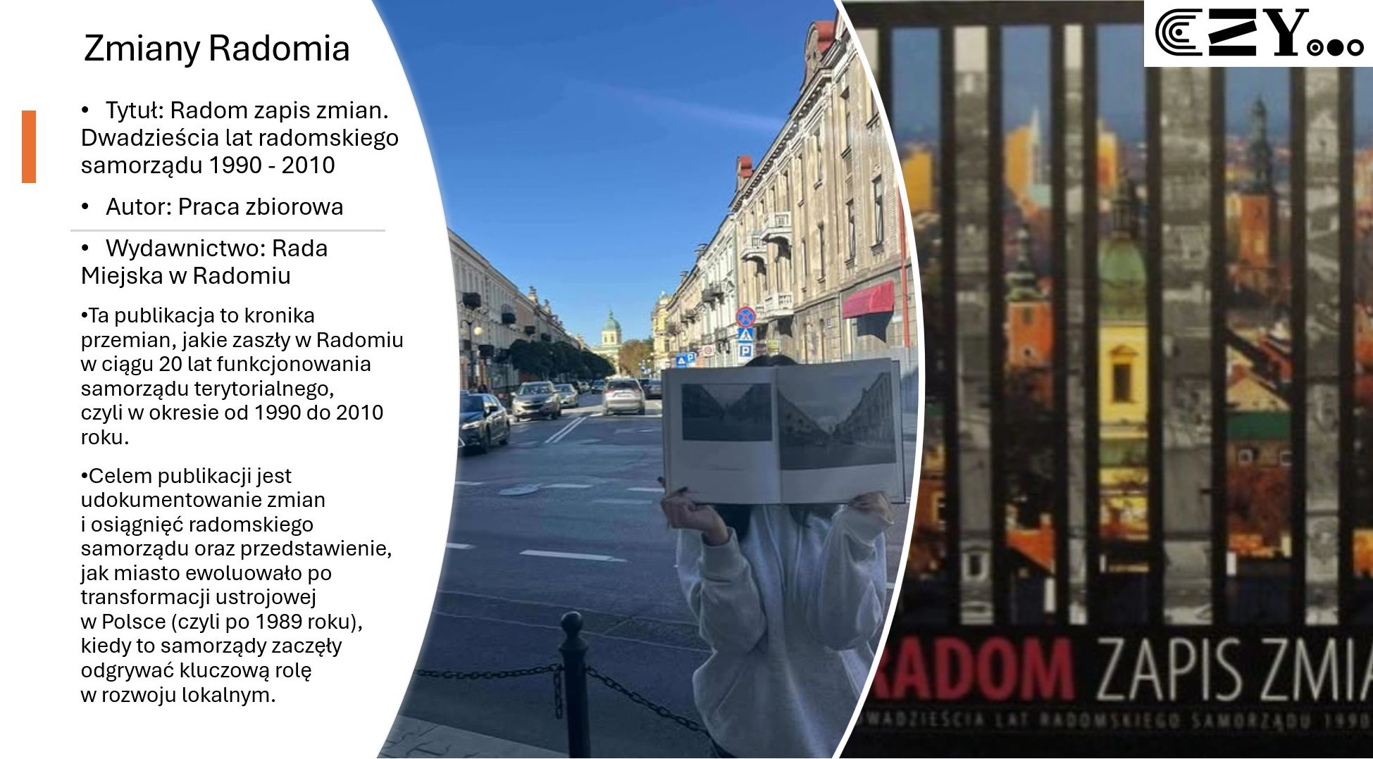 Uczniowie wykonali prezentację w programie Power Point, w której zaprezentowali wybrane książki ze szkolnego zbioru regionaliów, np. "Historię miasta Radomia" Czesława Tadeusza Zwolskiego, "Radom. Zabytki architektury" Aleksandra Sawickiego, "Radom w fotografii" Wojciecha Stana oraz "Radom. Zarys dziejów miasta" Sebastiana Piątkowskiego. Uczniowie przybliżyli historię wybranych miejsc w Radomiu i opatrzyli je zdjęciami przedstawiającymi zarówno ich historyczny, jak i współczesny wygląd.