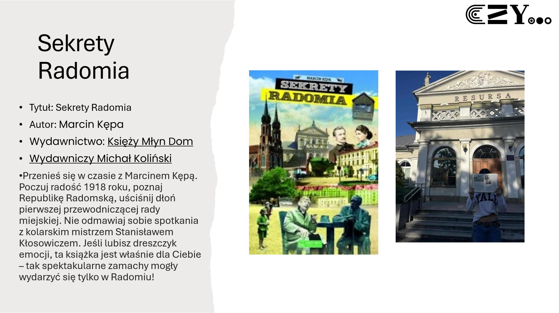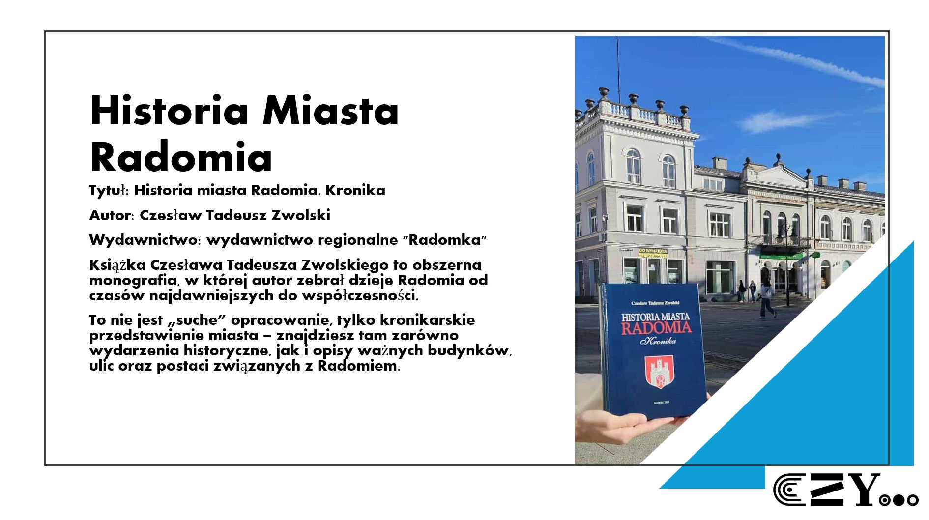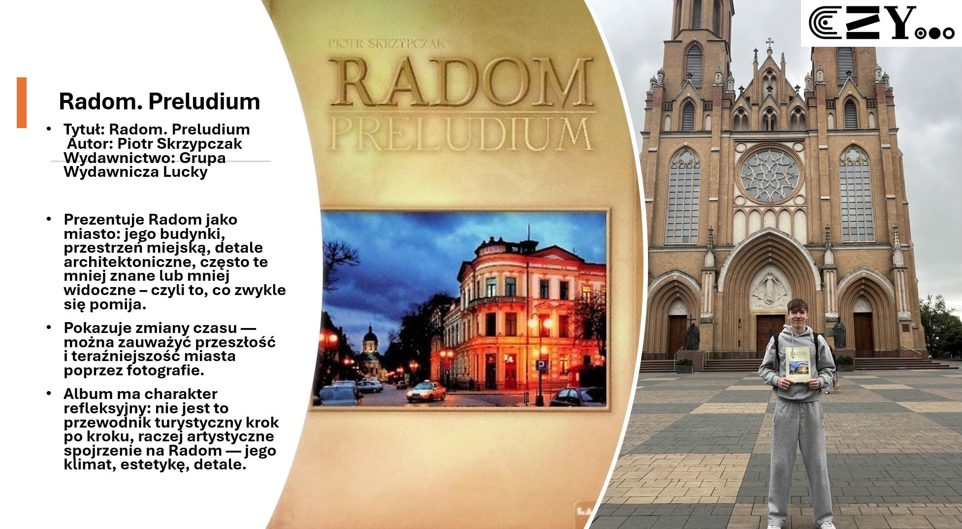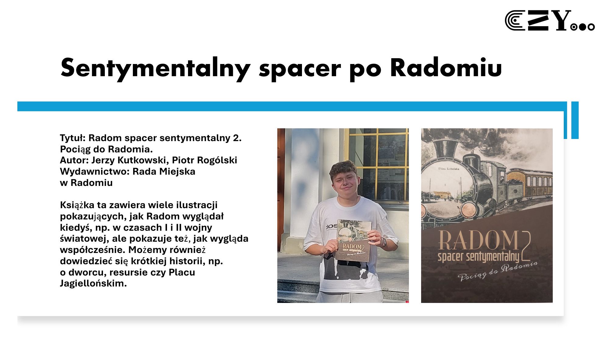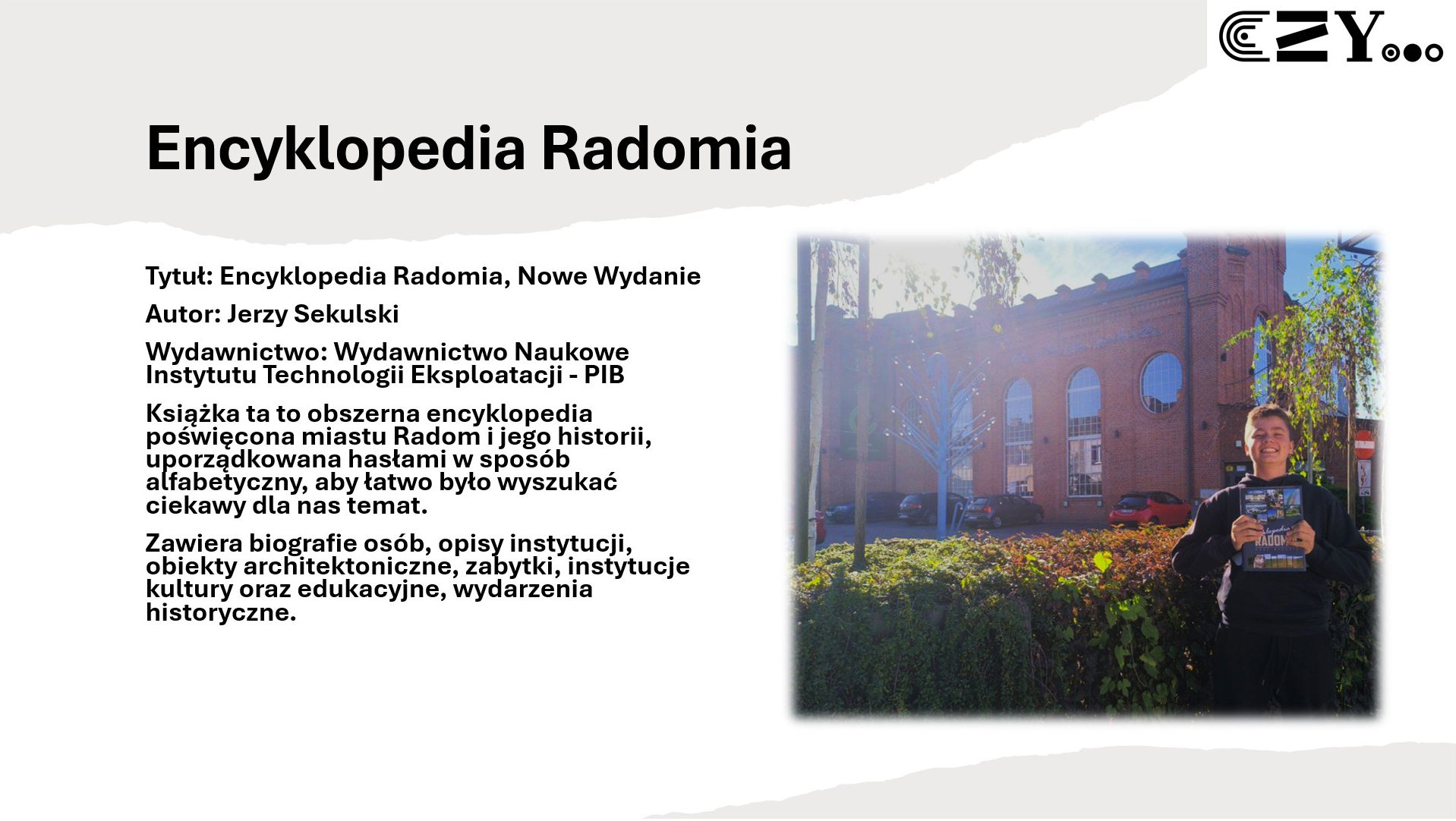 Uczniowie wykonali prezentację w programie Power Point, w której zaprezentowali wybrane książki ze szkolnego zbioru regionaliów, np. "Historię miasta Radomia" Czesława Tadeusza Zwolskiego, "Radom. Zabytki architektury" Aleksandra Sawickiego, "Radom w fotografii" Wojciecha Stana oraz "Radom. Zarys dziejów miasta" Sebastiana Piątkowskiego. Uczniowie przybliżyli historię wybranych miejsc w Radomiu i opatrzyli je zdjęciami przedstawiającymi zarówno ich historyczny, jak i współczesny wygląd.