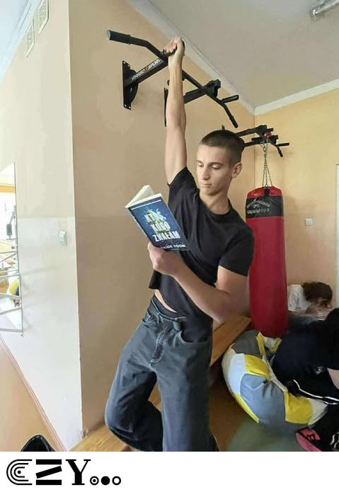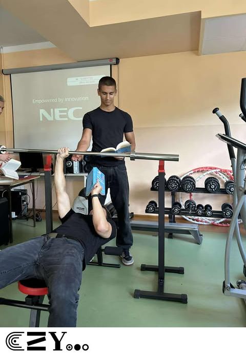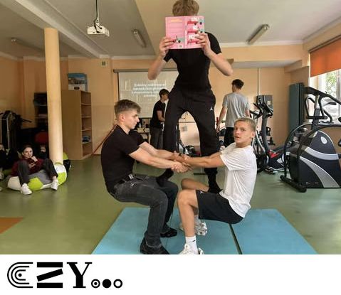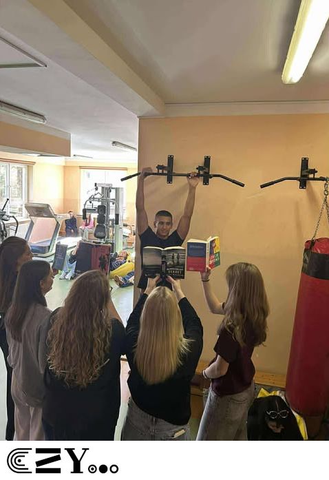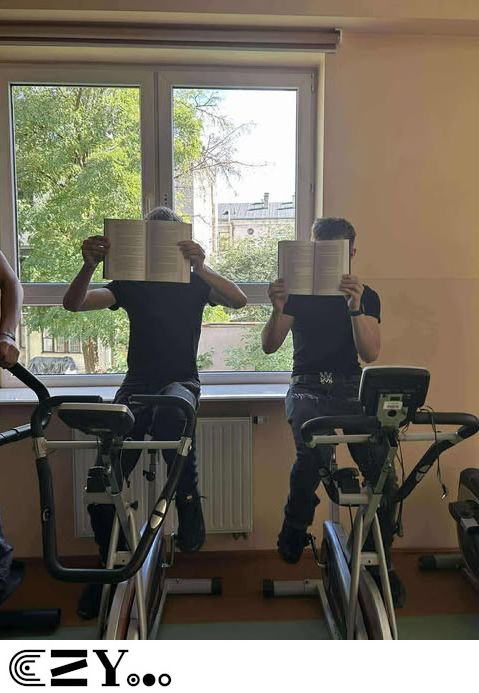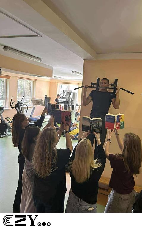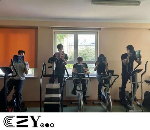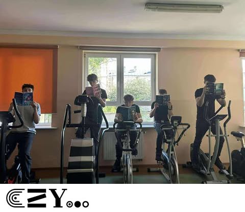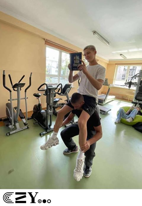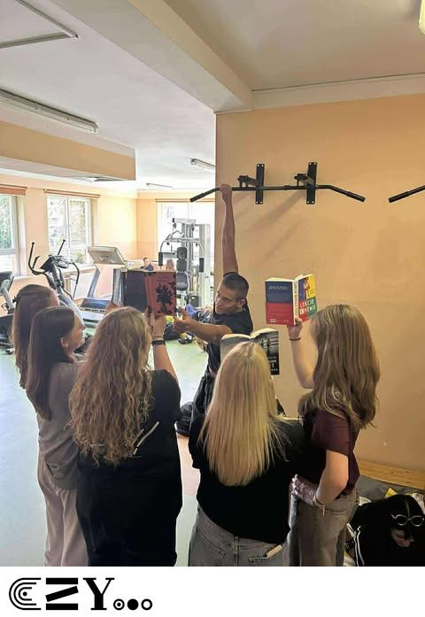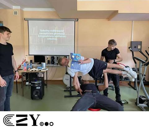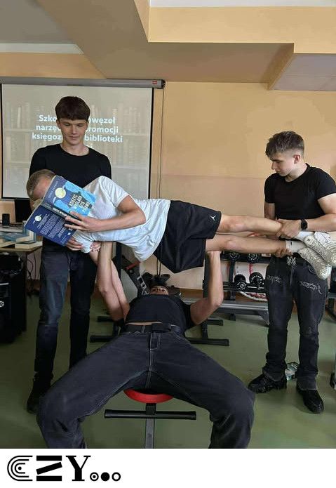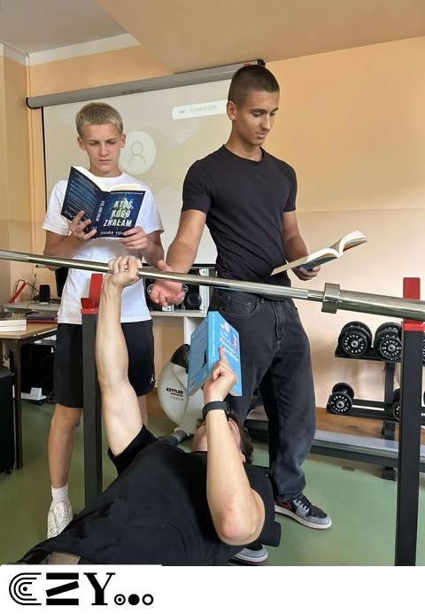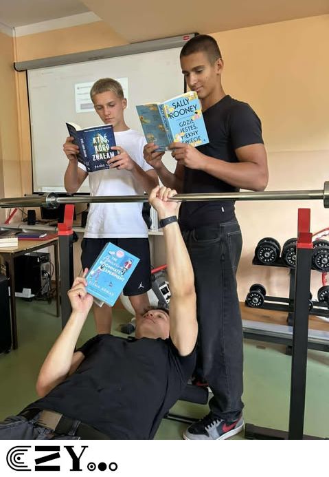 Uczniowie, jak przystało na klasę, której wychowawcą jest nauczyciel w-f, przeprowadzili akcję promującą wybrane książki ze szkolnego księgozbioru, łącząc w bardzo zaskakujący, ale też przepełniony energią sposób możliwości szkolnego radiowęzła z możliwościami szkolnej siłowni. Na zdjęciach zaprezentowanych poniżej można więc zobaczyć, w jakich pozycjach można czytać książki, rozwijając przy tym nie tylko umysł, ale i ciało.