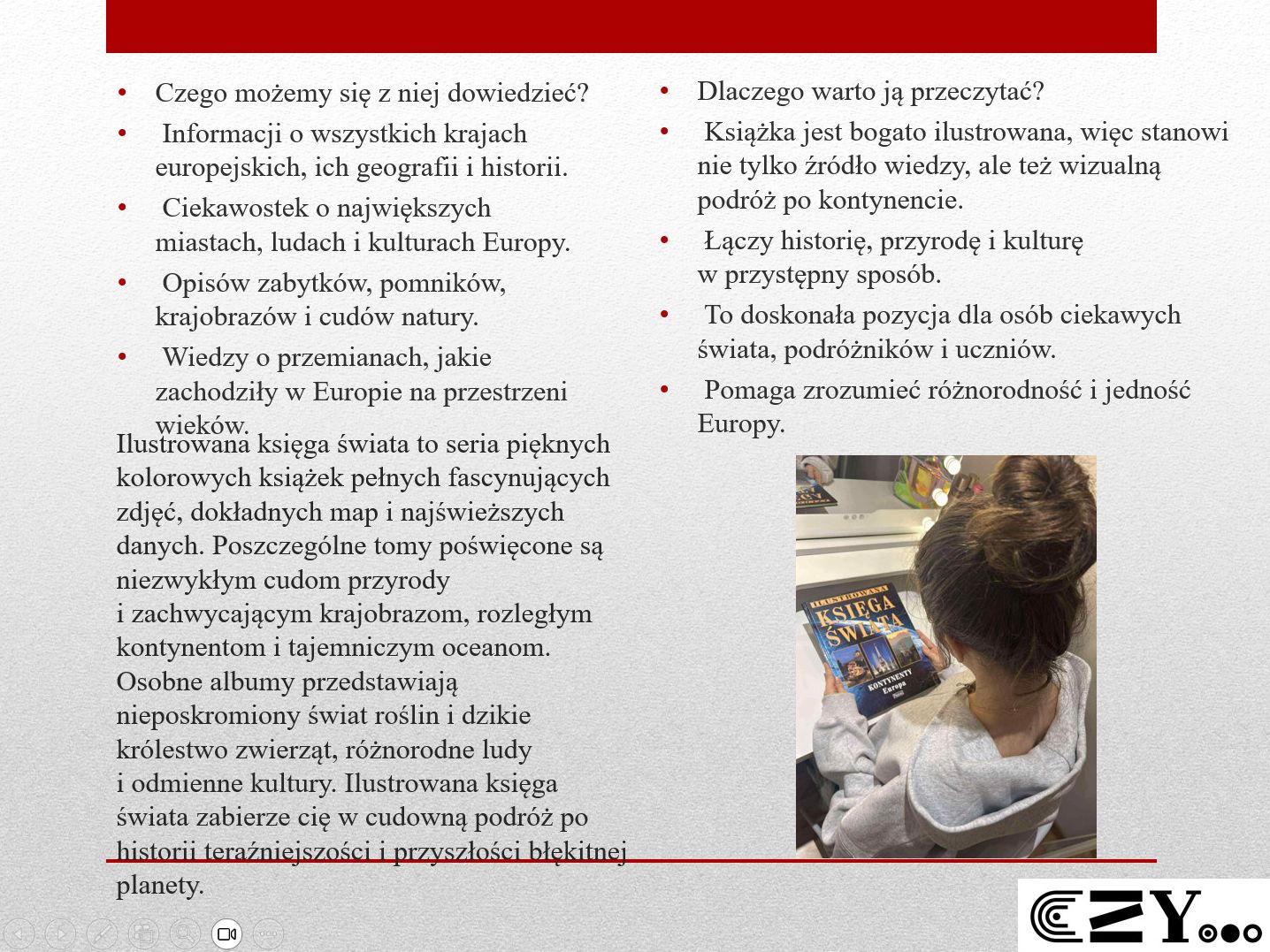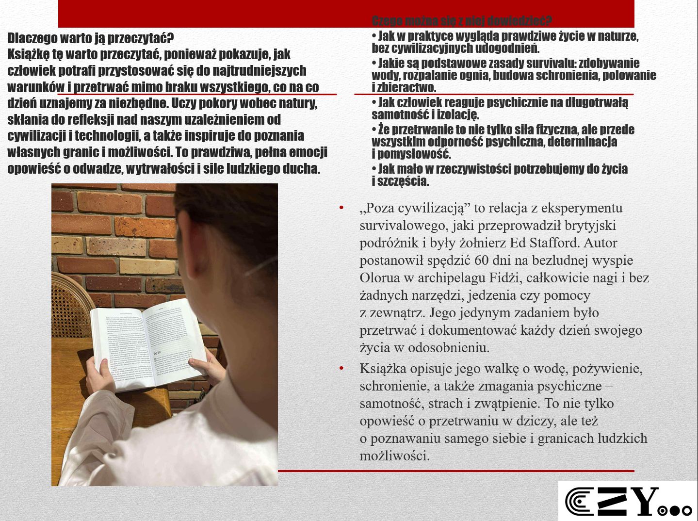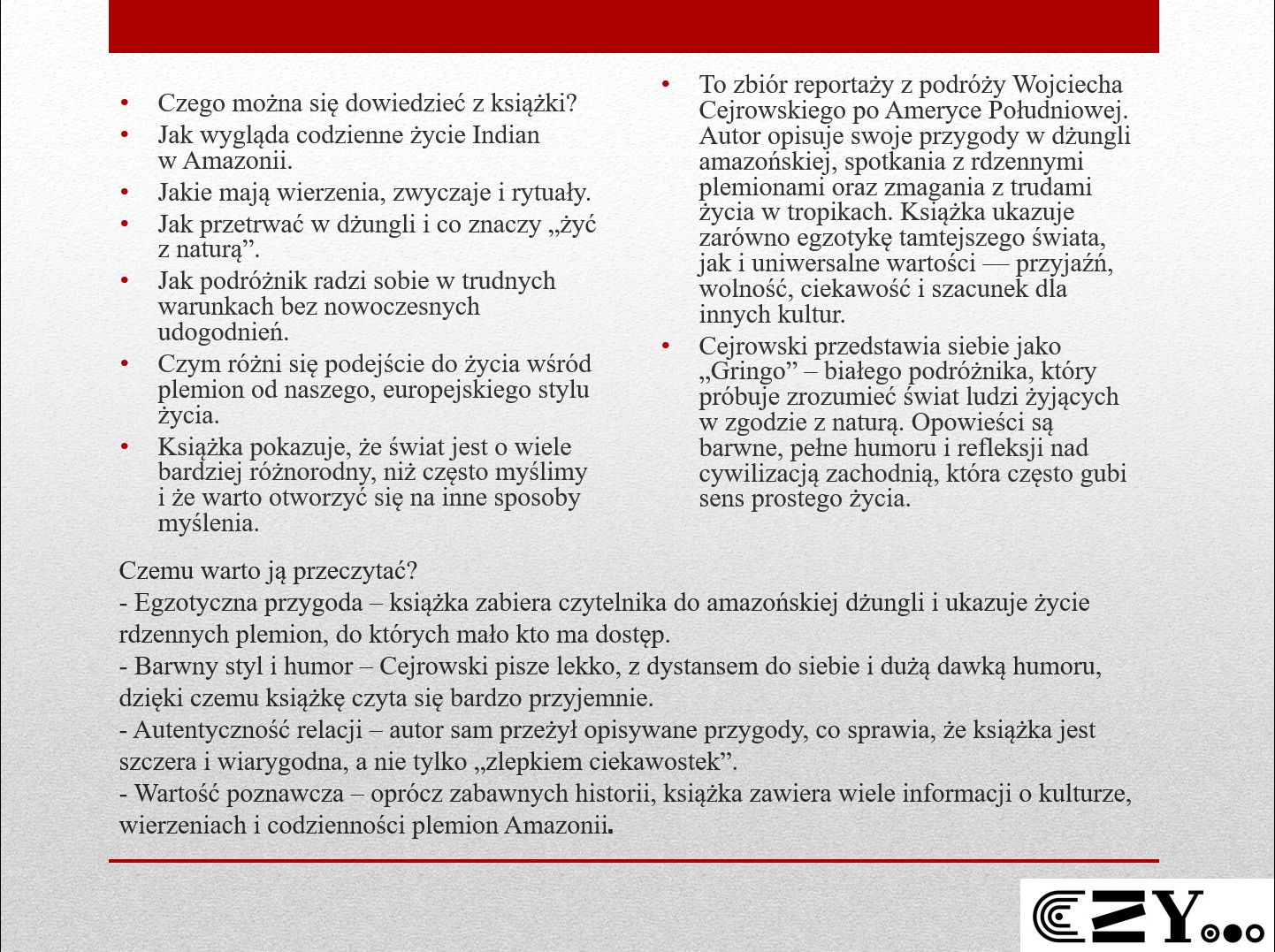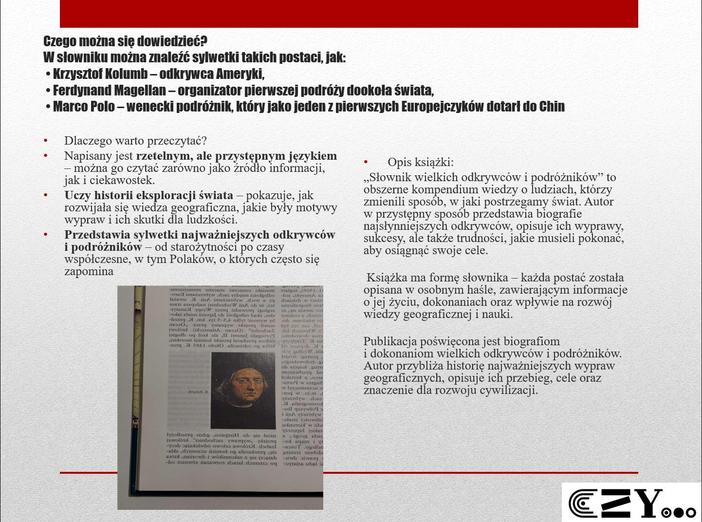 Uczniowie przygotowali prezentację w programie Power Point, w której przedstawili wybrane książki podróżnicze dostępne w bibliotece szkolnej. Zdjęcia i krótkie opisy bibliograficzne wzbogacili zaś informacjami dotyczącymi tego, dlaczego warto przeczytać wskazane publikacje i czego można dzięki tej lekturze dowiedzieć. Uczniowie przedstawili między innymi książkę "Rio Anaconda" Wojciecha Cejrowskiego, "Poza cywilizacją" Eda Stafforda, "Przewodnik po Hiszpanii" Janiny Pałeckiej i Oskara Sobańskiego czy też "Poznanie Czarnego Lądu" Józefa Szaflarskiego.