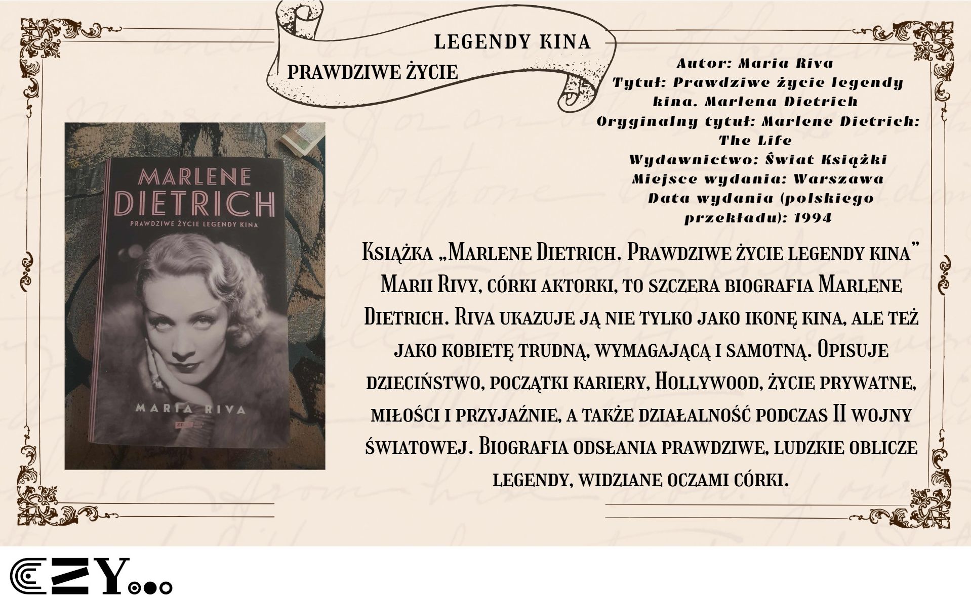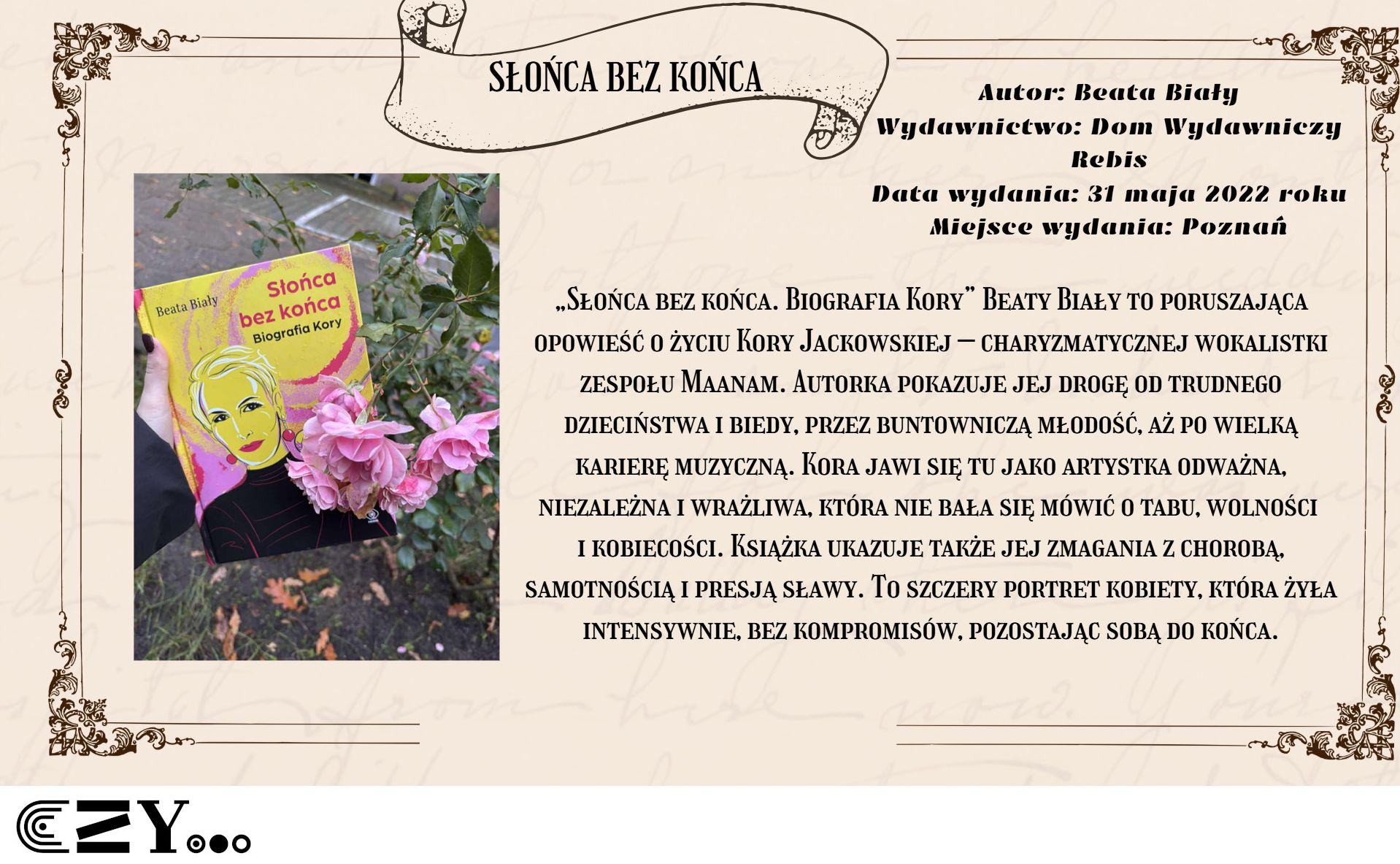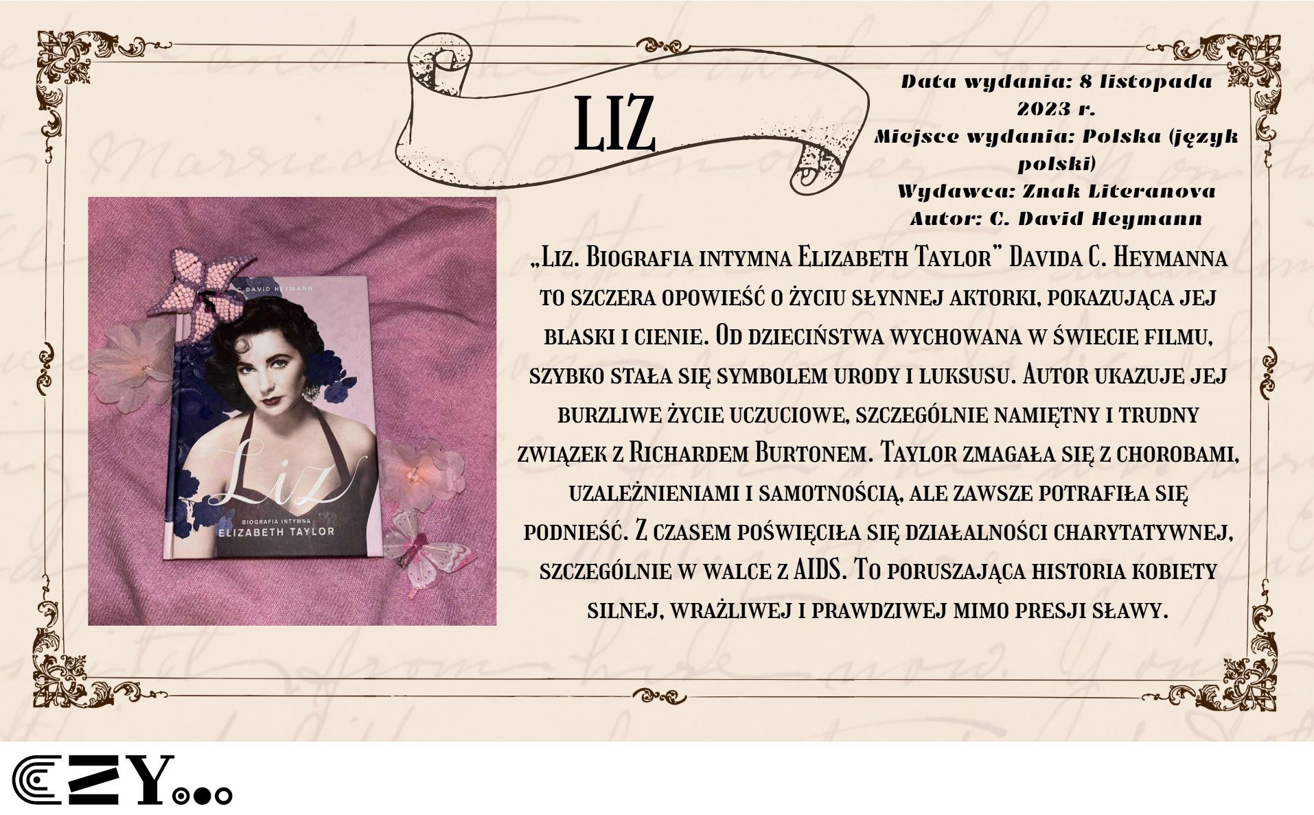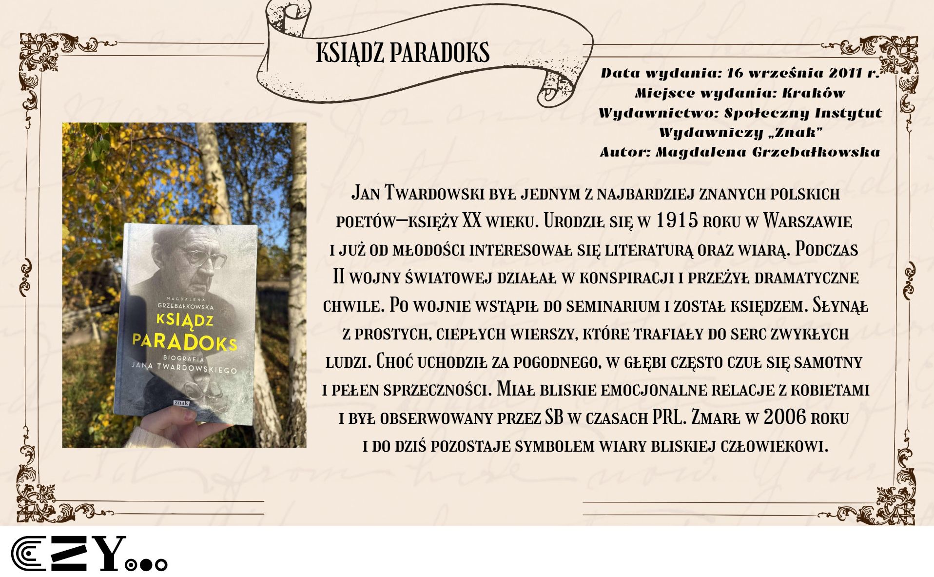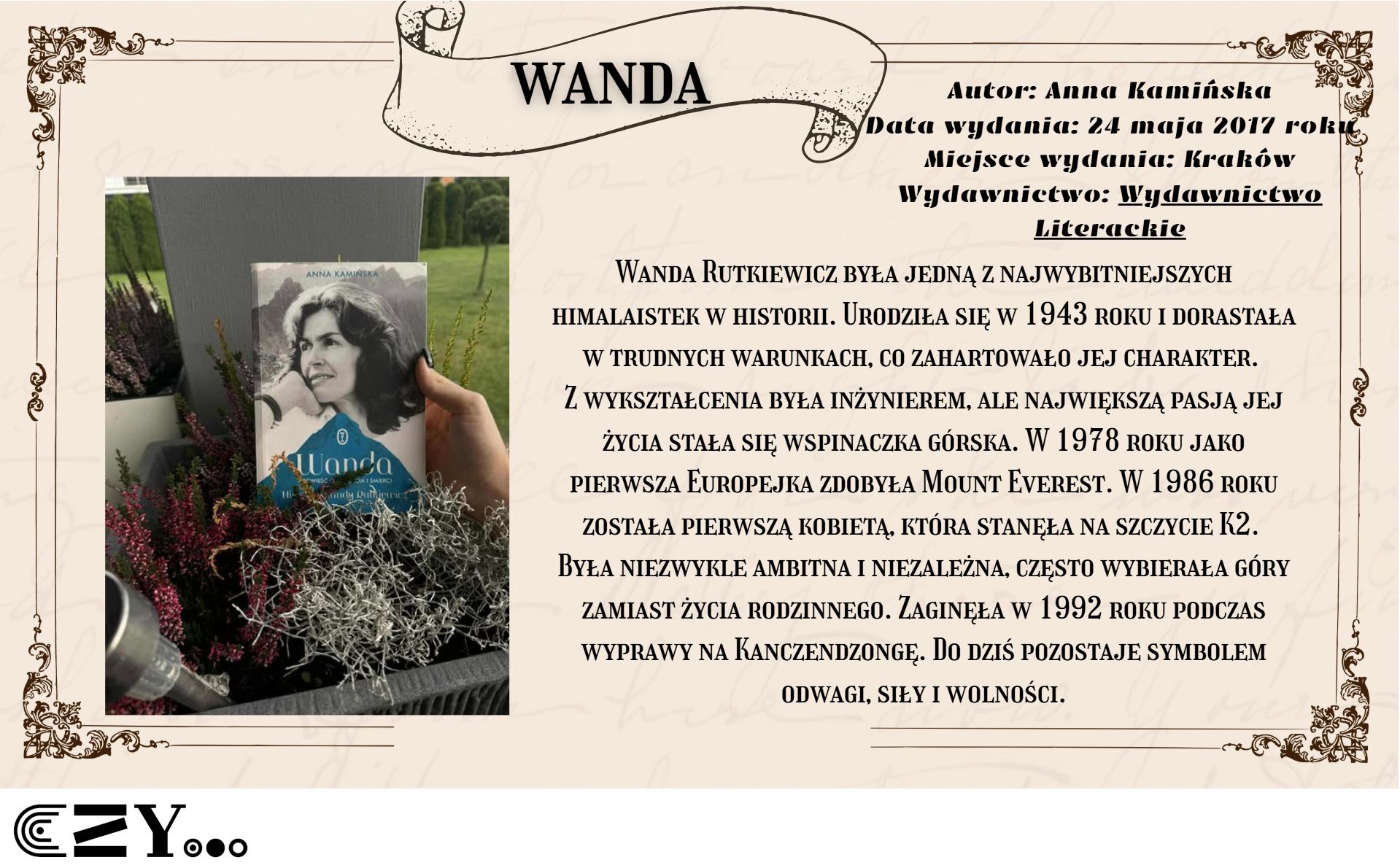 Uczennice przygotowały prezentację w programie Canva, w której przedstawiły wybrane książki biograficzne dostępne w bibliotece szkolnej. Prezentacja przybliża między innymi takie książki, jak: Anna Kamińska "Wanda. Opowieść o sile życia i śmierci. Historia Wandy Rutkiewicz", Magdalena Grzebałkowska "Ksiądz Paradoks. Biografia Jana Twardowskiego", Mariusz Urbanek "Tuwim. Wylękniony bluźnierca" czy też "Beata Biały "Słońca bez końca. Biografia Kory". Opisy książek zostały wzbogacone dodatkowo zdjęciami, które przedstawiają uczennice czytające wybrane książki.