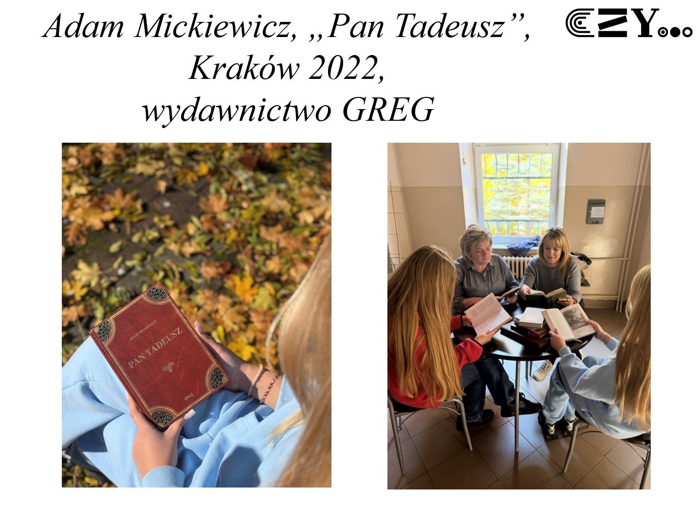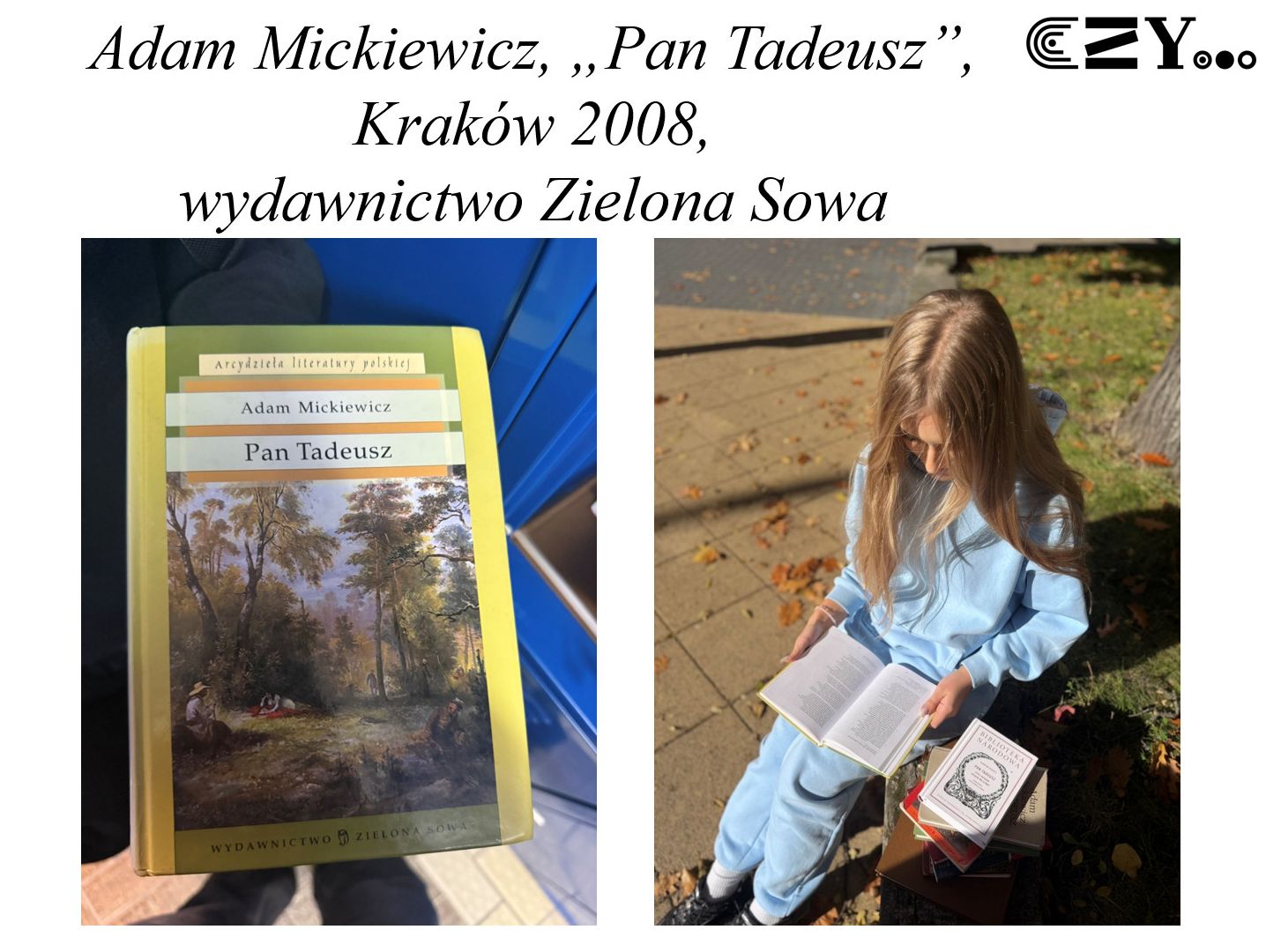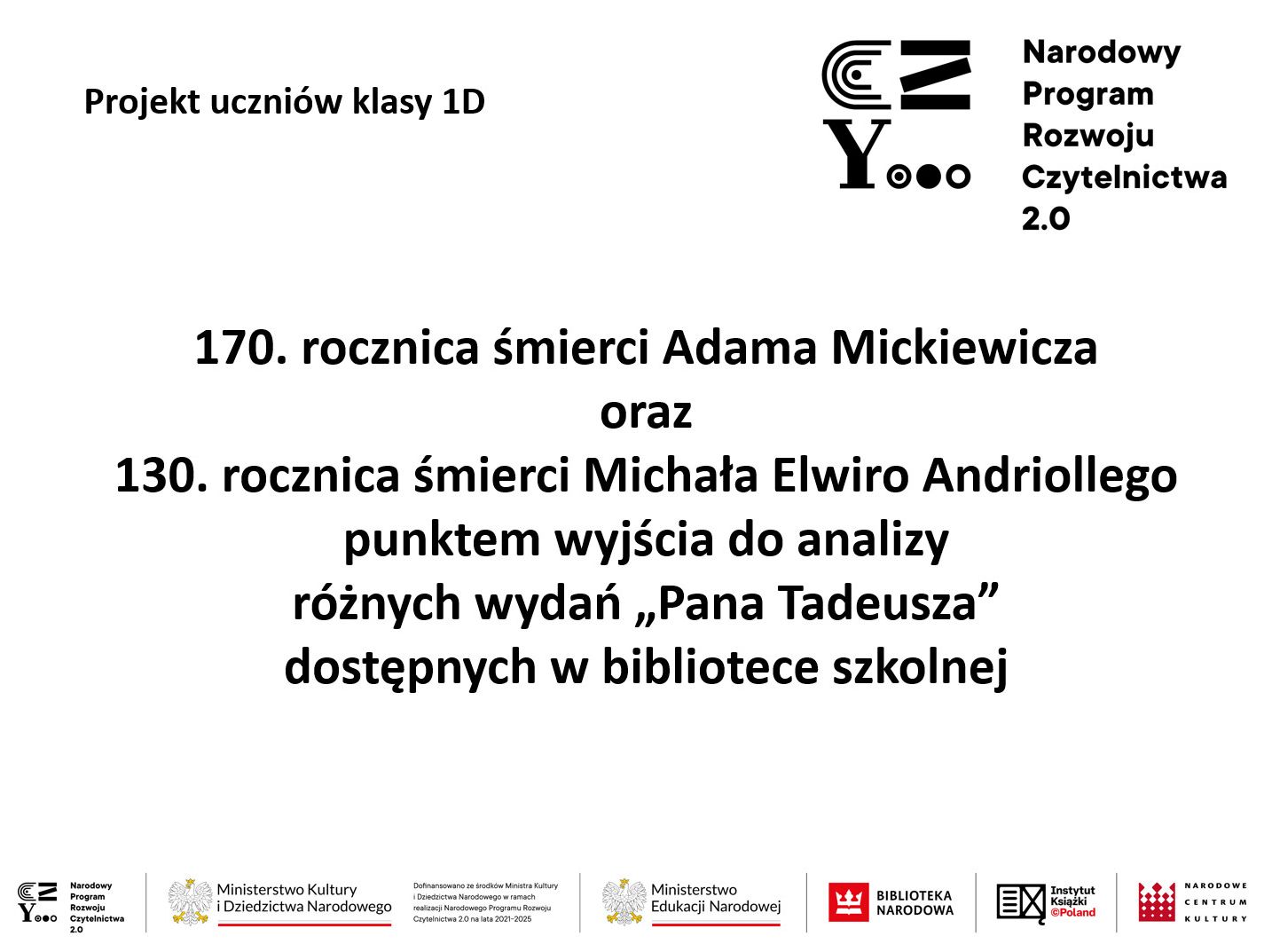 W ramach realizacji Narodowego Programu Rozwoju Czytelnictwa 2.0 uczniowie klasy 1D - pod opieką p. Agnieszki Ficek, wychowawcy klasy oraz nauczyciela języka niemieckiego - w listopadzie 2025 roku wykonali projekt edukacyjny pt. "170. rocznica śmierci Adama Mickiewicza oraz 130. rocznica śmierci Michała Elwiro Andriollego punktem wyjścia do analizy różnych wydań „Pana Tadeusza” dostępnych w bibliotece szkolnej".