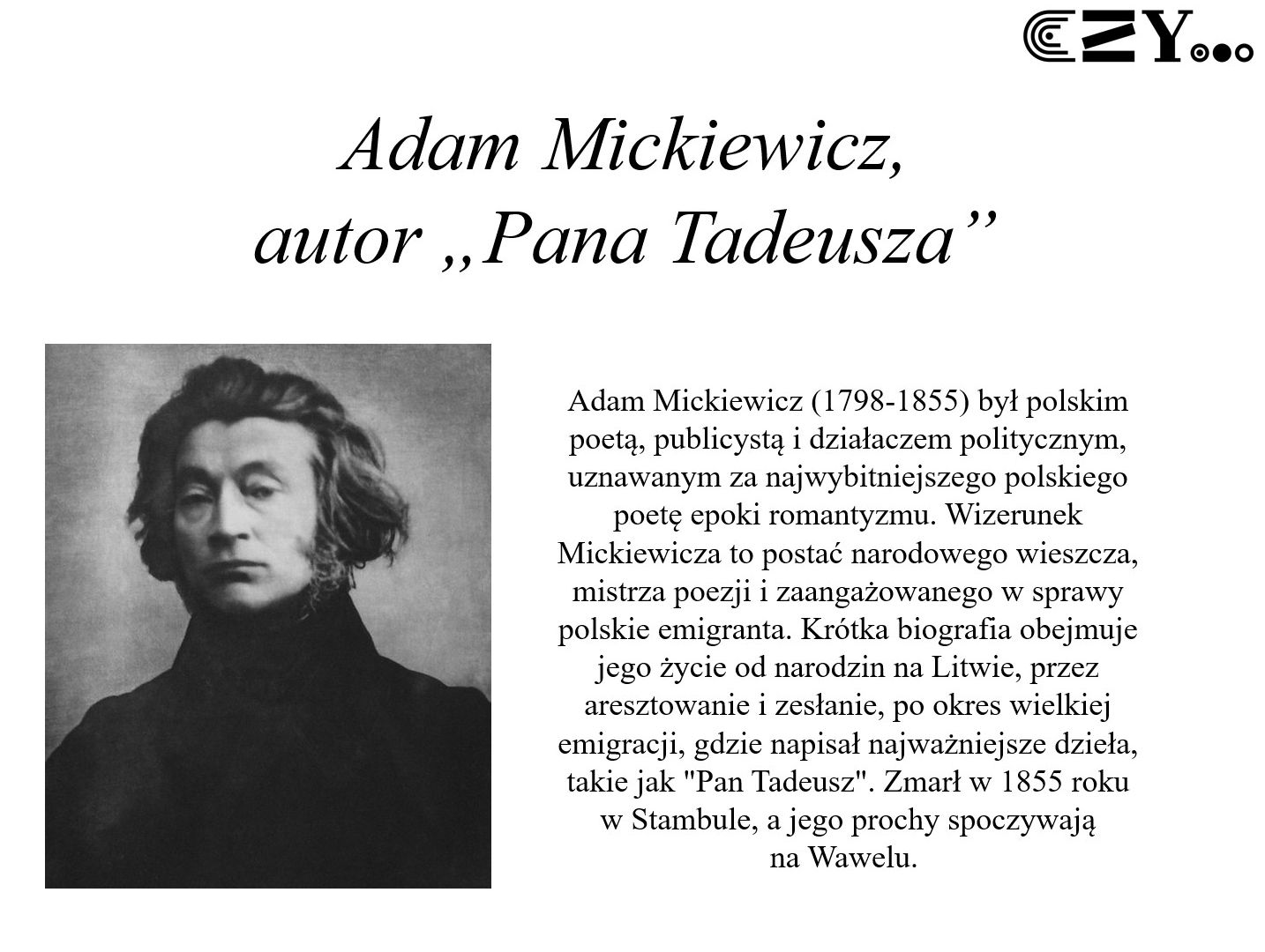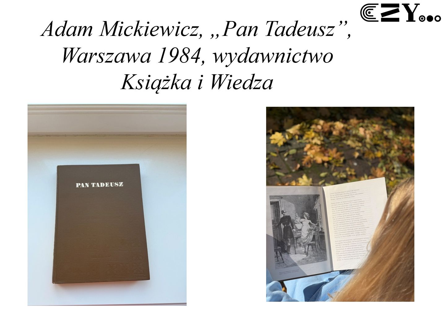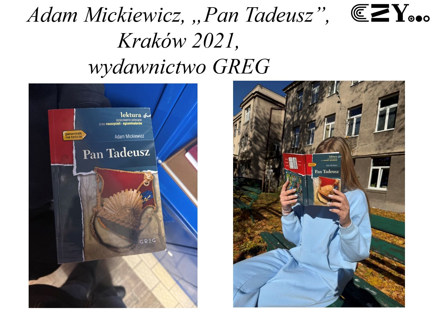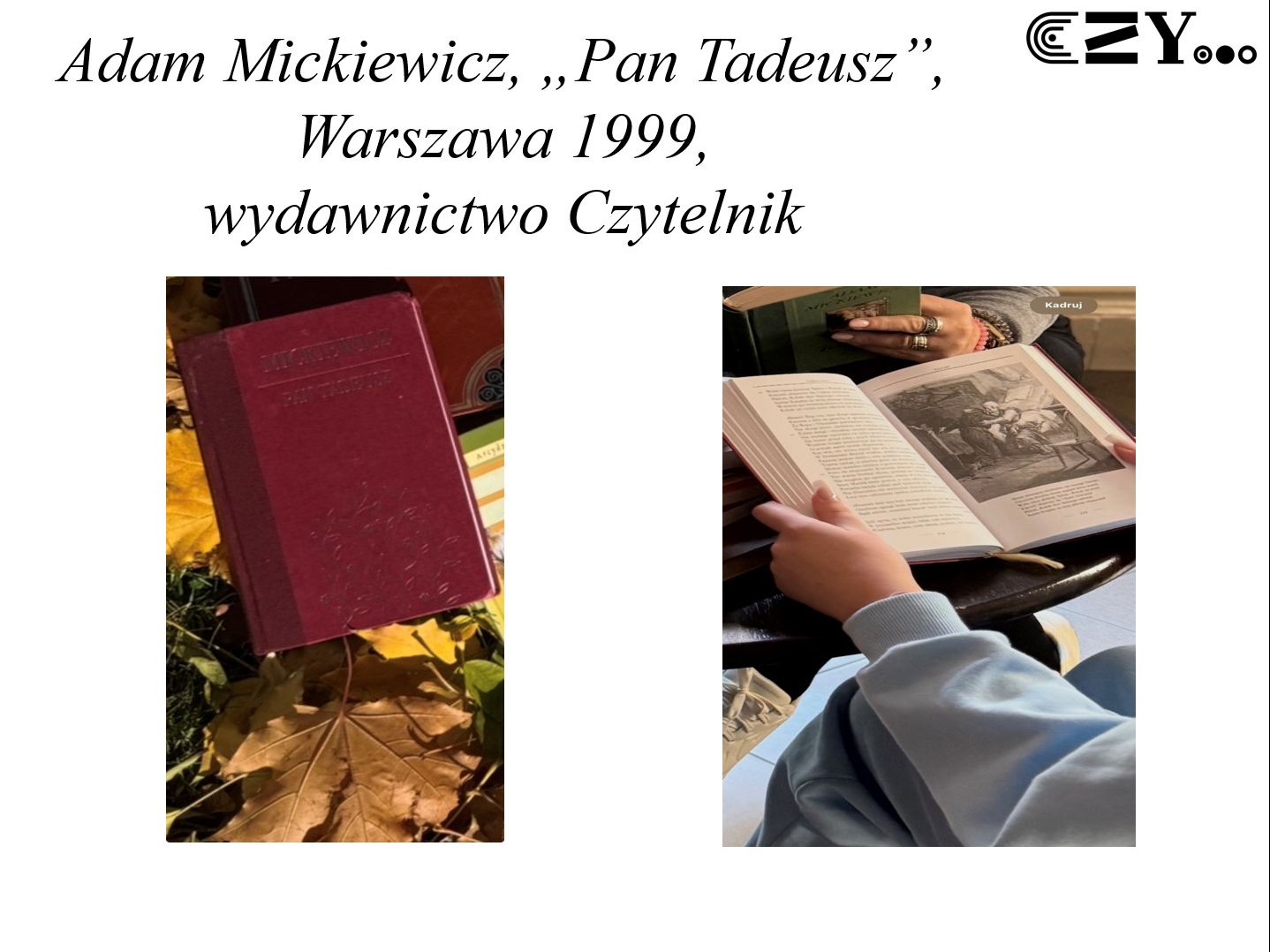 Uczniowie przygotowali prezentację w programie Power Point, w której przedstawili krótkie biogramy Adama Mickiewicza oraz Michała Elwiro Andriollego, jako autora i ilustratora epopei narodowej "Pan Tadeusz". Prezentacja zawiera także zdjęcia przedstawiające osoby czytające poszczególne wydania tej lektury, także ilustrowane, dostępne w bibliotece szkolnej, które - zgodnie z tytułem projektu - zostały ukazane bardziej szczegółowo. Uczniowie w swoim projekcie zaprezentowali różne wydania "Pana Tadeusza" z takich wydawnictw, jak: Zakład Narodowy im. Ossolińskich, Książka i Wiedza, Czytelnik, Zielona Sowa oraz Greg.
