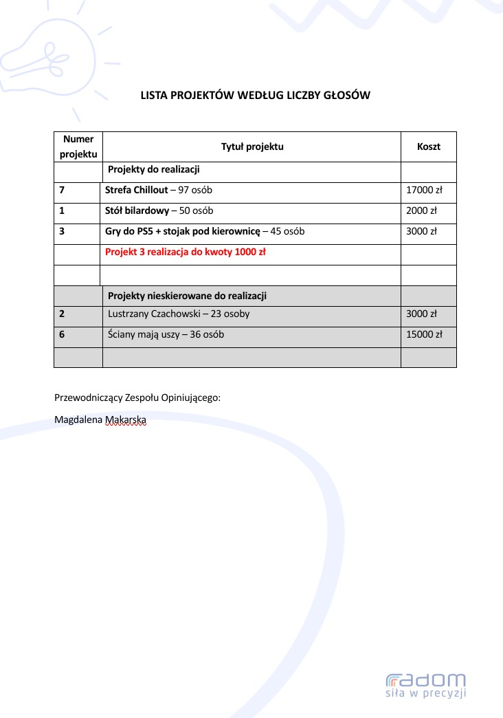 Uprzejmie informujemy, że w II edycji Szkolnego Budżetu Obywatelskiego najwięcej głosów zdobył projekt na Strefę Chillout'u. Dodatkowo zrealizowany zostanie zakup stołu do bilarda, ten projekt zajął drugie miejsce w głosowaniu. Trzeci projekt Gry do PS5+ stojak pod kierownicę zostanie zrealizowany do kwoty 1000 zł, ze względu na ograniczenie wynikające z limitu kwoty 20 tys. zł. przeznaczonej na realizację Szkolnego Budżetu Obywatelskiego.
