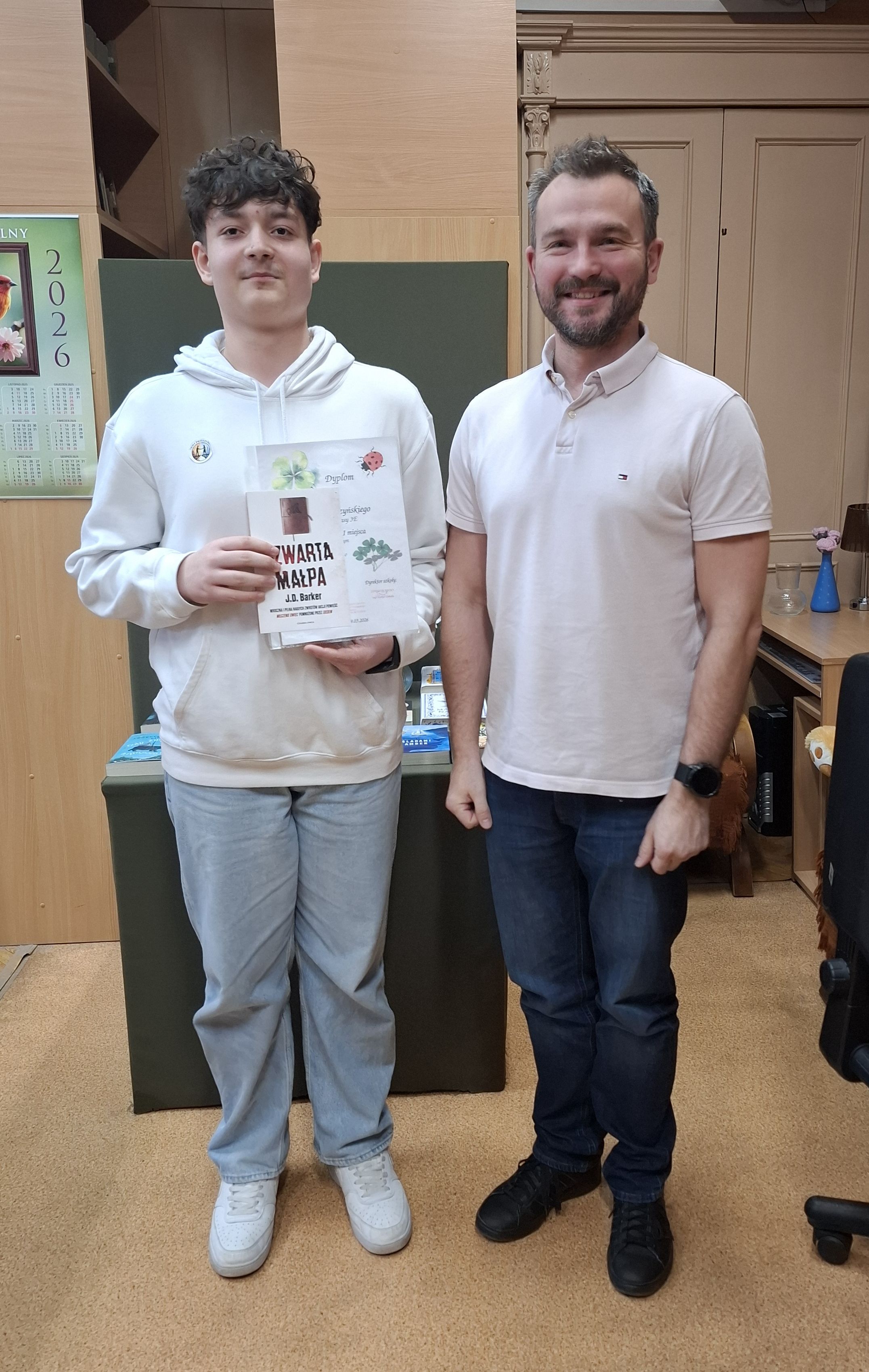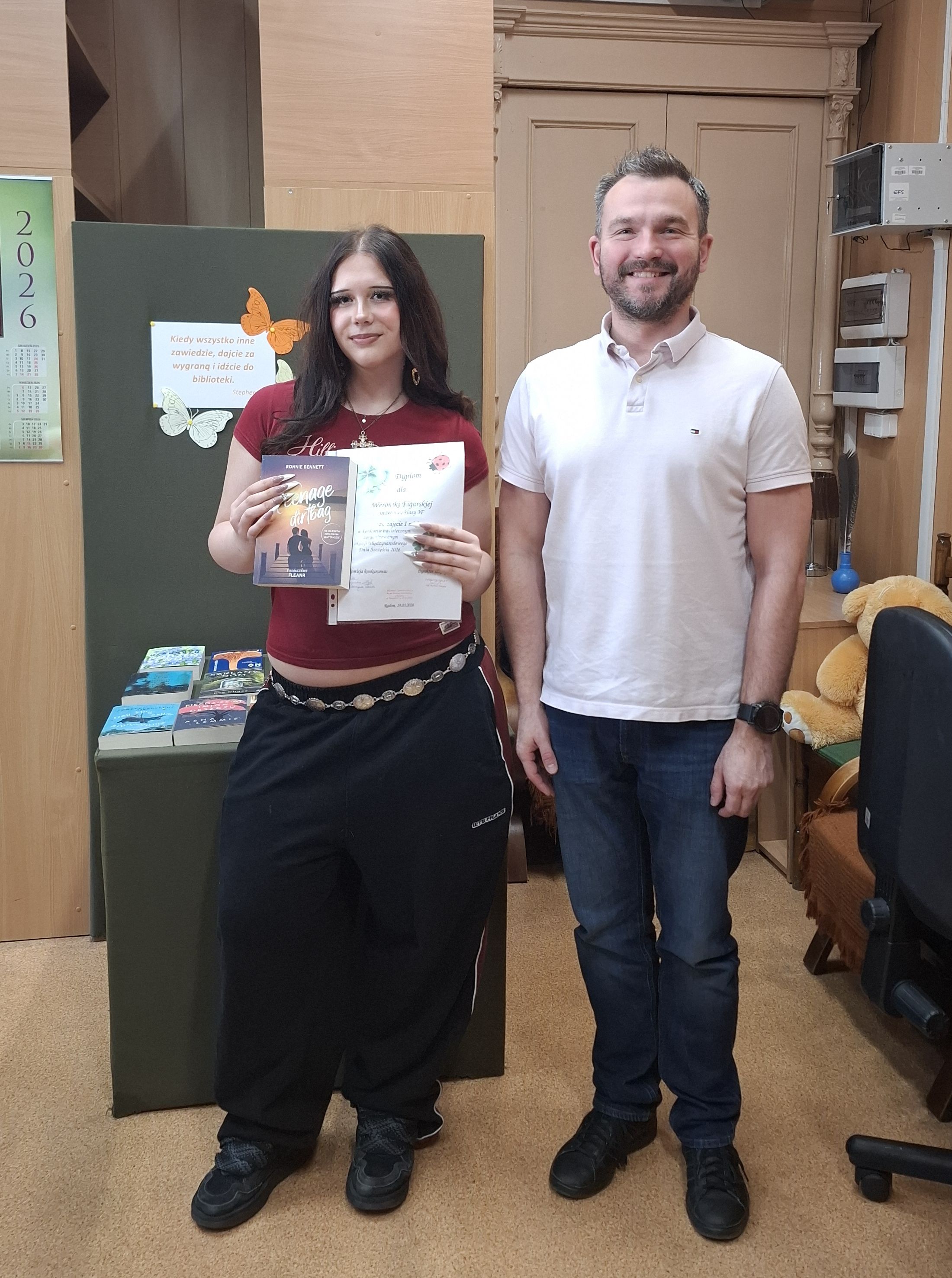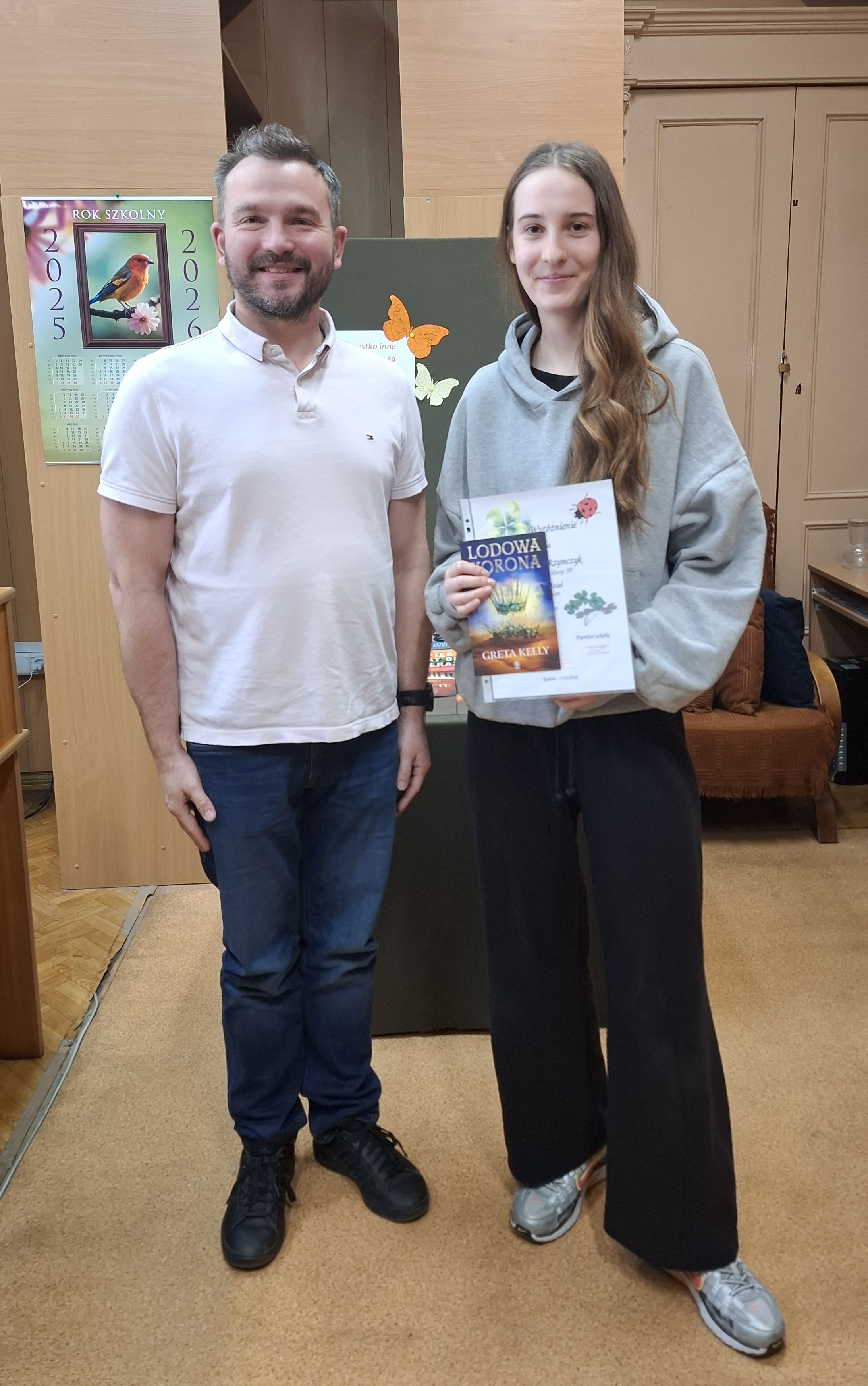 Nagrody książkowe ufundowane przez Wydawnictwo Znak, Dom Wydawniczy Rebis oraz Wydawnictwo Czarna Owca, a także pamiątkowe dyplomy wręczył zwycięzcom Dyrektor szkoły, p. Norbert Sałuda.