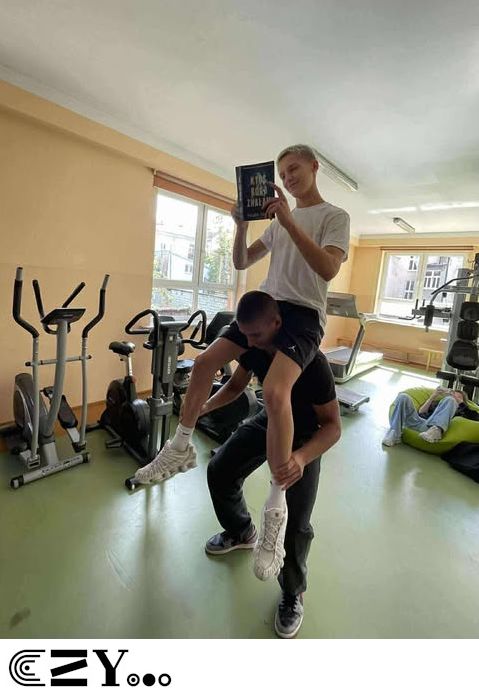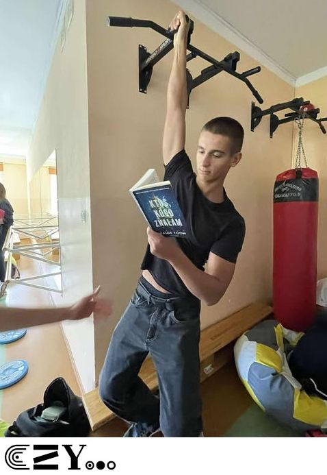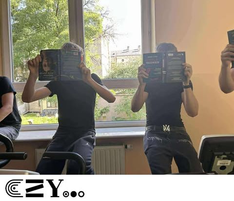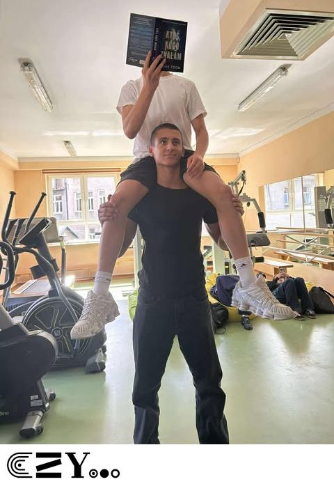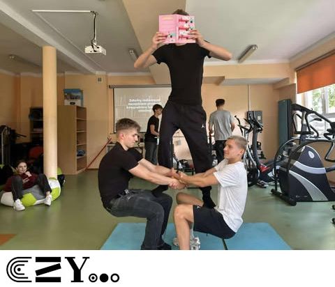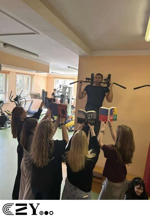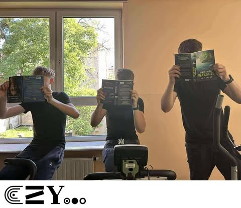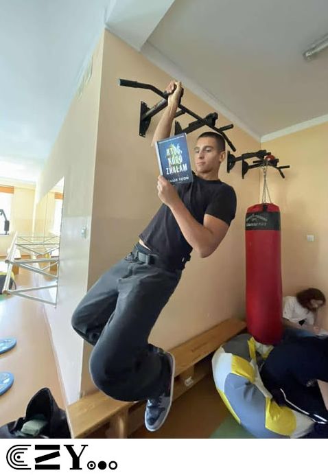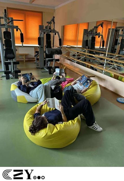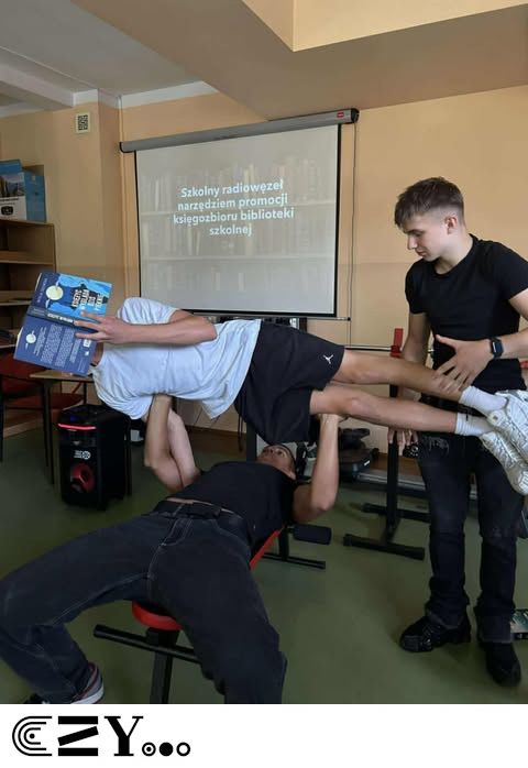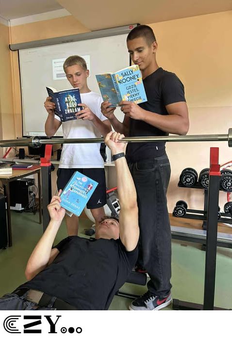 Uczniowie, jak przystało na klasę, której wychowawcą jest nauczyciel w-f, przeprowadzili akcję promującą wybrane książki ze szkolnego księgozbioru, łącząc w bardzo zaskakujący, ale też przepełniony energią sposób możliwości szkolnego radiowęzła z możliwościami szkolnej siłowni. Na zdjęciach zaprezentowanych poniżej można więc zobaczyć, w jakich pozycjach można czytać książki, rozwijając przy tym nie tylko umysł, ale i ciało.