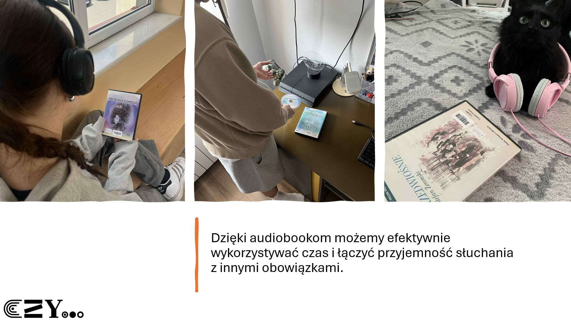 Mamy nadzieję, że prezentacja przygotowana przez uczniów klasy 4F zachęci Was do sięgnięcia po książki nie tylko w wersji tradycyjnej, ale także dźwiękowej. Zapraszamy Was do naszej biblioteki szkolnej do zapoznania się z działem audiobooków, w którym - zapewniamy Was - nie znajdują się jedynie lektury szkolne. Znajdziecie tam również inne "książki", w tym kryminały.