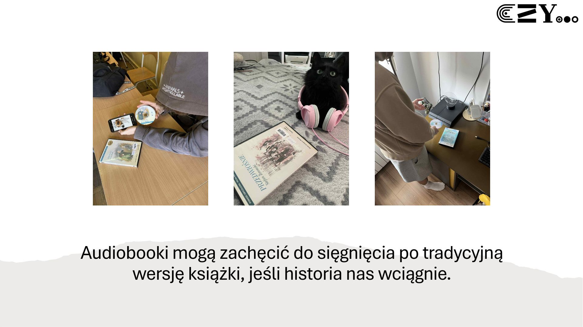 Uczniowie przygotowali prezentację w programie Power Point, w której przedstawili argumenty za czytaniem książek papierowych i poznawaniem ich za pośrednictwem słuchania audiobooków.