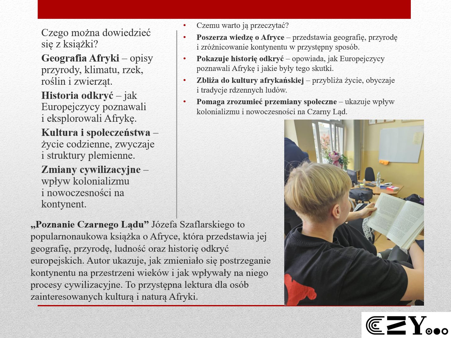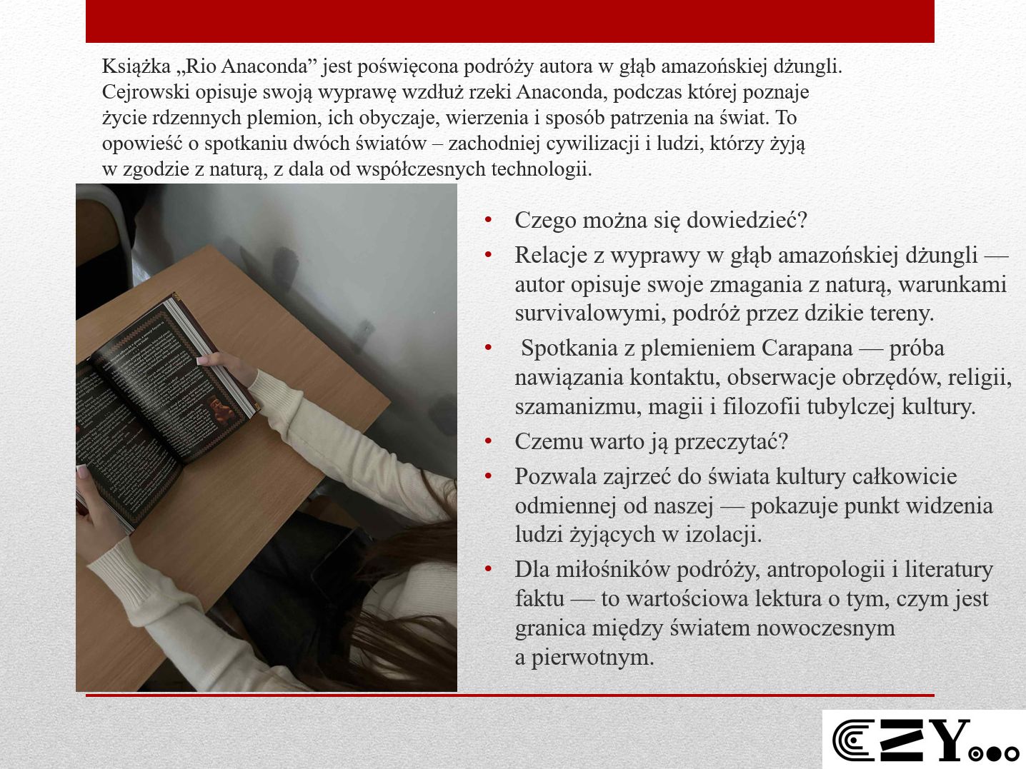 Uczniowie przygotowali prezentację w programie Power Point, w której przedstawili wybrane książki podróżnicze dostępne w bibliotece szkolnej. Zdjęcia i krótkie opisy bibliograficzne wzbogacili zaś informacjami dotyczącymi tego, dlaczego warto przeczytać wskazane publikacje i czego można dzięki tej lekturze dowiedzieć. Uczniowie przedstawili między innymi książkę "Rio Anaconda" Wojciecha Cejrowskiego, "Poza cywilizacją" Eda Stafforda, "Przewodnik po Hiszpanii" Janiny Pałeckiej i Oskara Sobańskiego czy też "Poznanie Czarnego Lądu" Józefa Szaflarskiego.