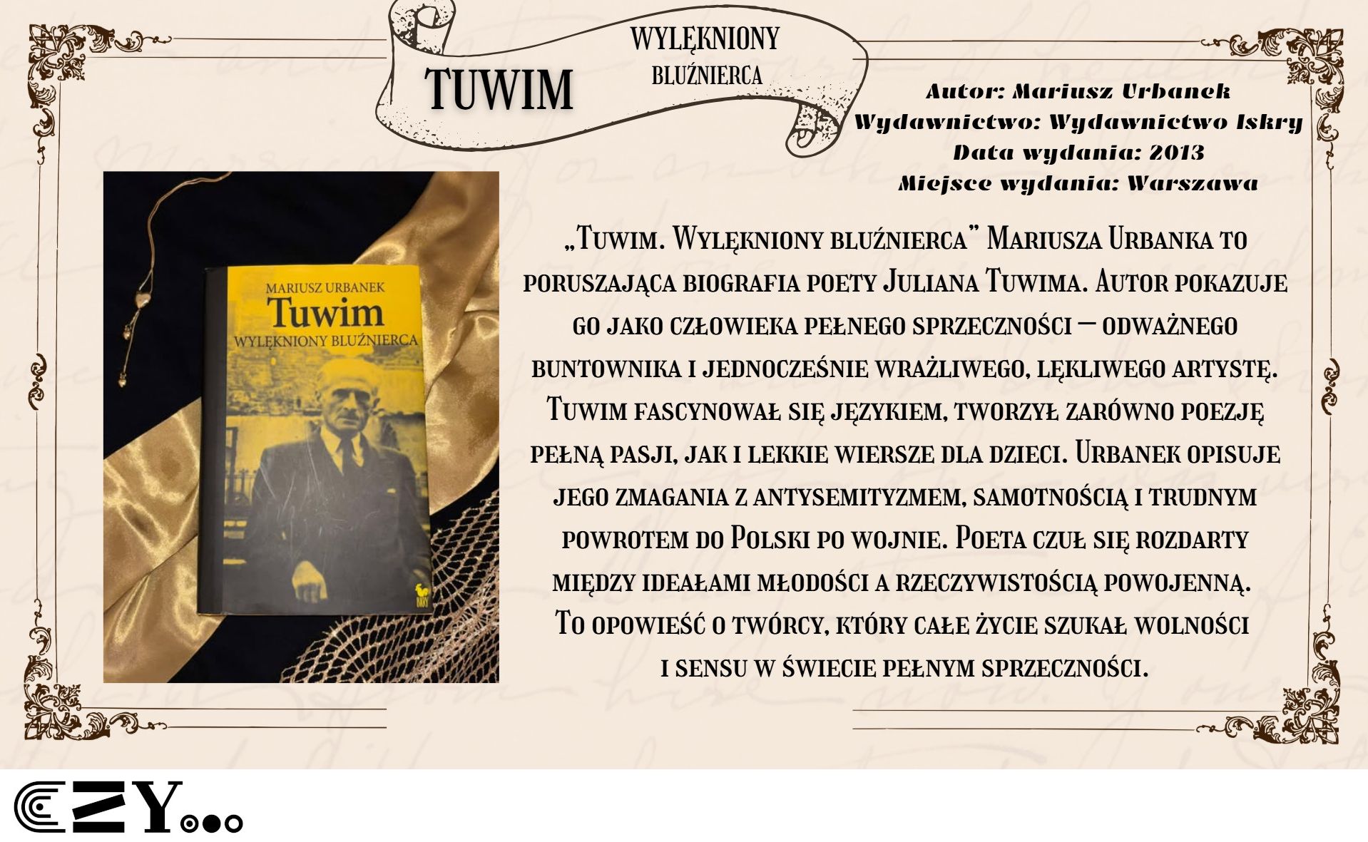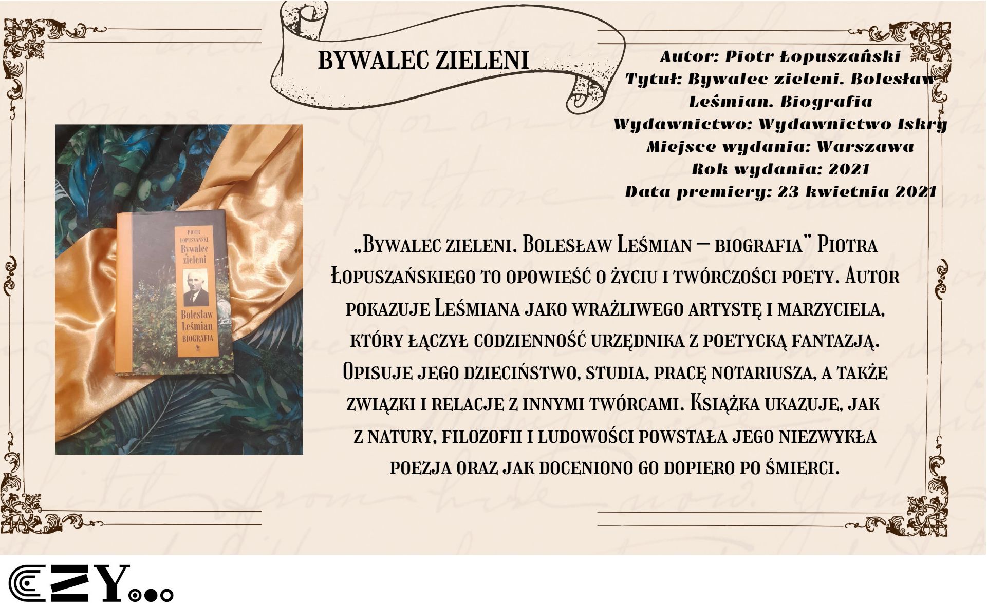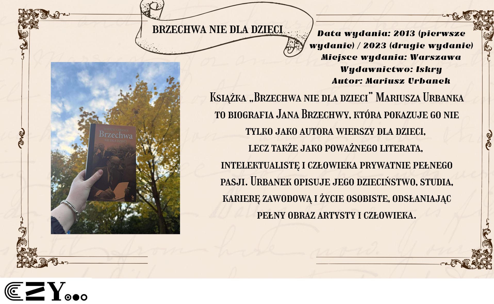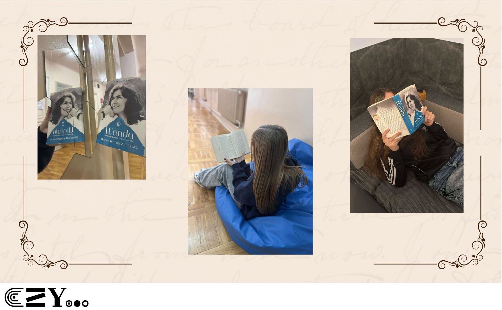 Uczennice przygotowały prezentację w programie Canva, w której przedstawiły wybrane książki biograficzne dostępne w bibliotece szkolnej. Prezentacja przybliża między innymi takie książki, jak: Anna Kamińska "Wanda. Opowieść o sile życia i śmierci. Historia Wandy Rutkiewicz", Magdalena Grzebałkowska "Ksiądz Paradoks. Biografia Jana Twardowskiego", Mariusz Urbanek "Tuwim. Wylękniony bluźnierca" czy też "Beata Biały "Słońca bez końca. Biografia Kory". Opisy książek zostały wzbogacone dodatkowo zdjęciami, które przedstawiają uczennice czytające wybrane książki.
